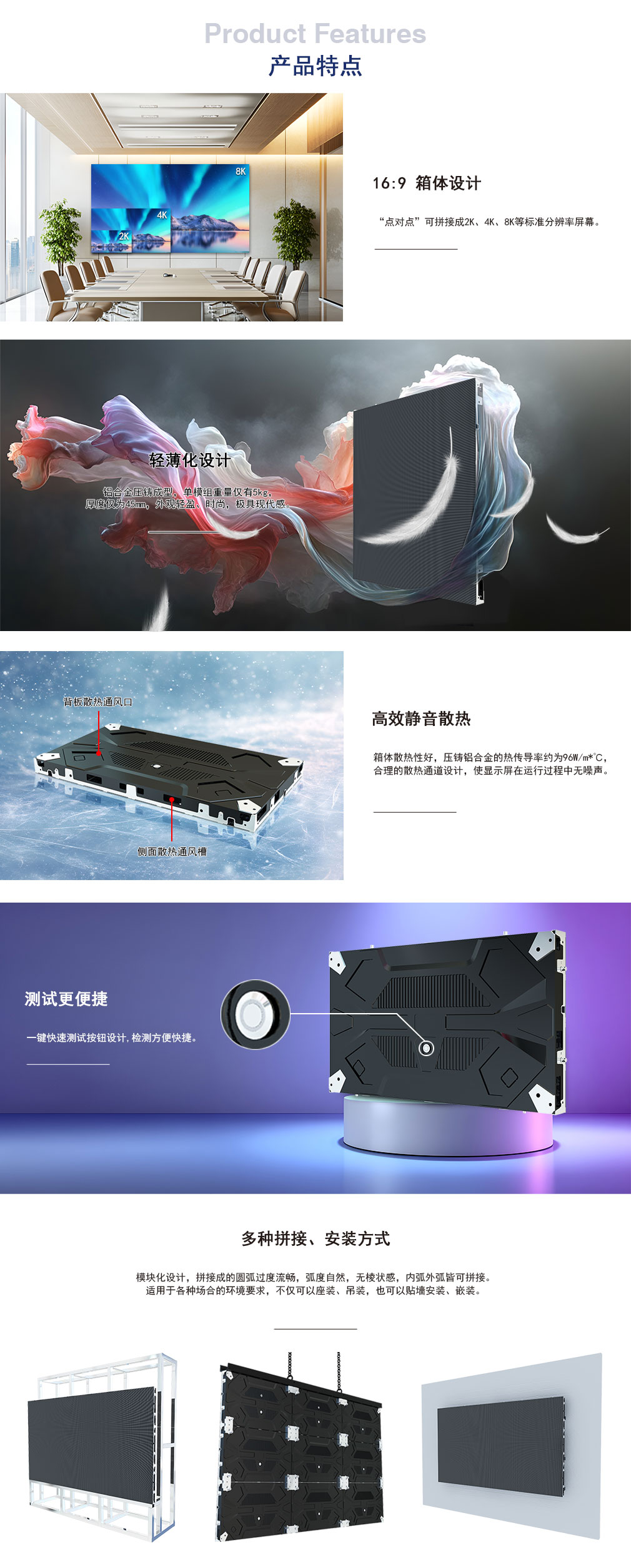 - 描述: 應用場景 : 室內 產品類型 : 小間距,表貼 點間距 : P0.7/P0.9/P1.1/P1.2/P1.5/P1.8/P2.5 產品特點: 1. 16:9設計; 2. 純前維護; 3. 更輕,單模組5.85Kg,29Kg/㎡; 4. 更薄,厚度只有50mm; 5. 拆裝更方便,真空吸附拆裝,2秒即可完成單個模塊的拆卸; 6. 優化電路設計,低灰更細膩,灰度漸變更平滑; 7. 共陰設計,更穩定,更節能; 8. 一鍵快速測試按鈕設計,檢測方便快捷。