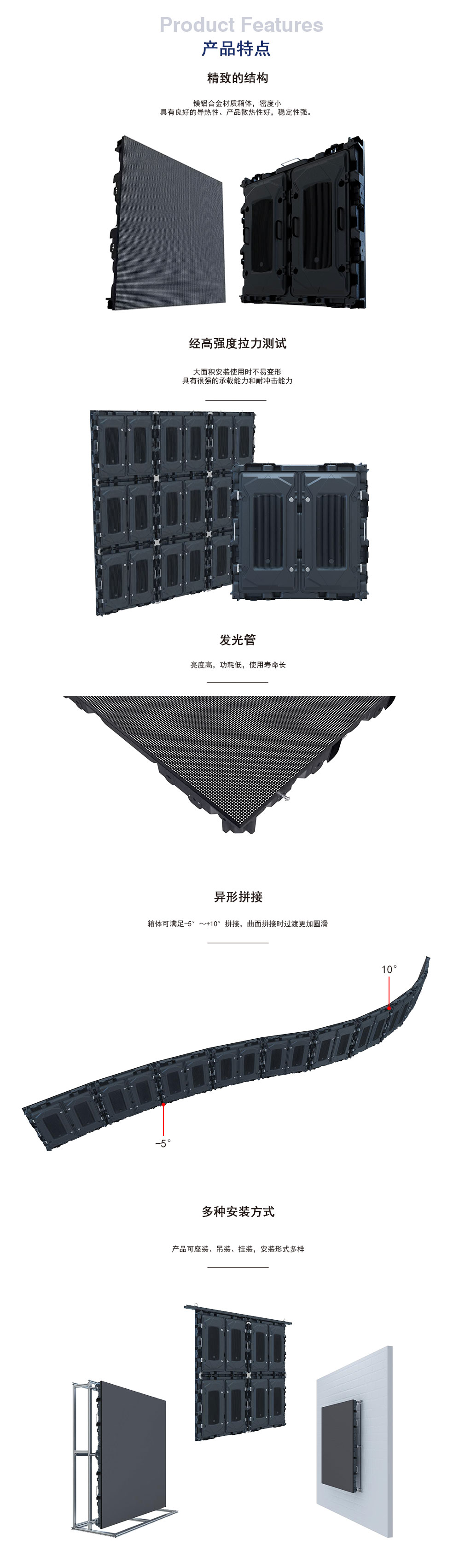 1.標準化設計,箱體為鎂鋁合金壓鑄成形,經高精度CNC二次加工,精度可達0. 2mm,整屏拼裝精度及平面度高;