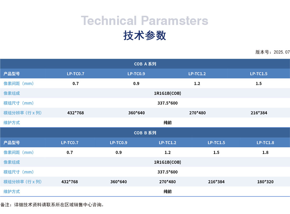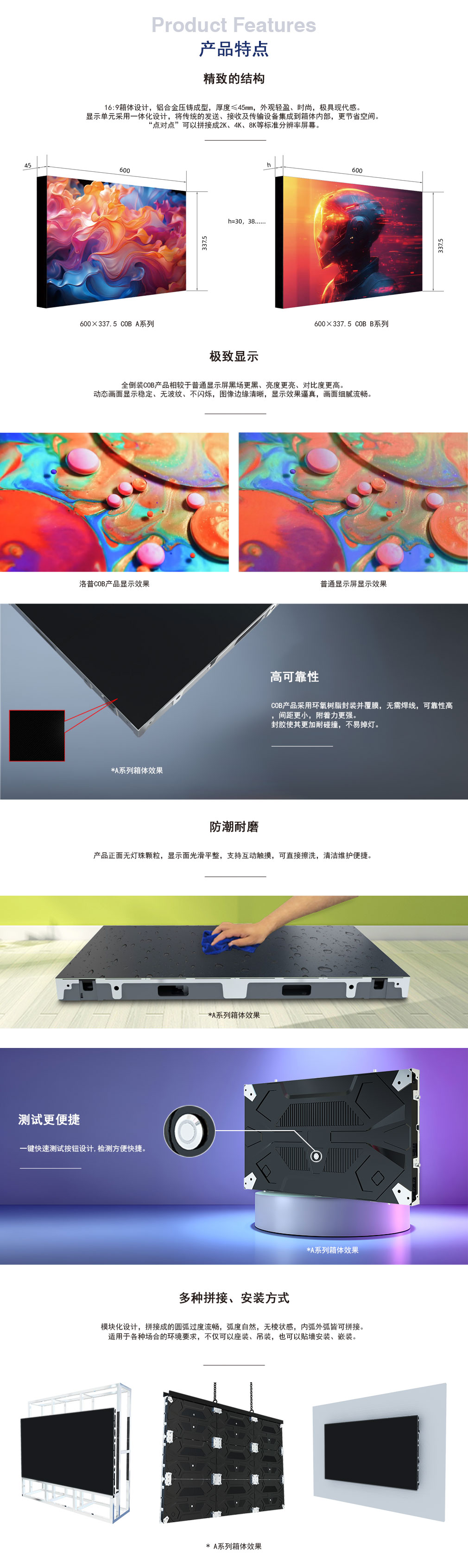 - 描述: 應用場景 : 室內 產品類型 : 小間距 點間距 : P0.7/P0.9//P1.2P1.5/P1.8 產品特點: 1. 16:9設計; 2. 純前維護; 3. 更輕,單模組5.85Kg,29Kg/㎡; 4. 拆裝更方便,真空吸附拆裝,2秒即可完成單個模塊的拆卸; 5. 高可靠性,COB采用環氧樹脂封裝并覆膜,間距更小,附著力更強; 6.防潮耐磨,產品正面無燈珠顆粒,顯示面光滑平整,可直接擦洗; 7. 一鍵快速測試按鈕設計,檢測方便快捷。